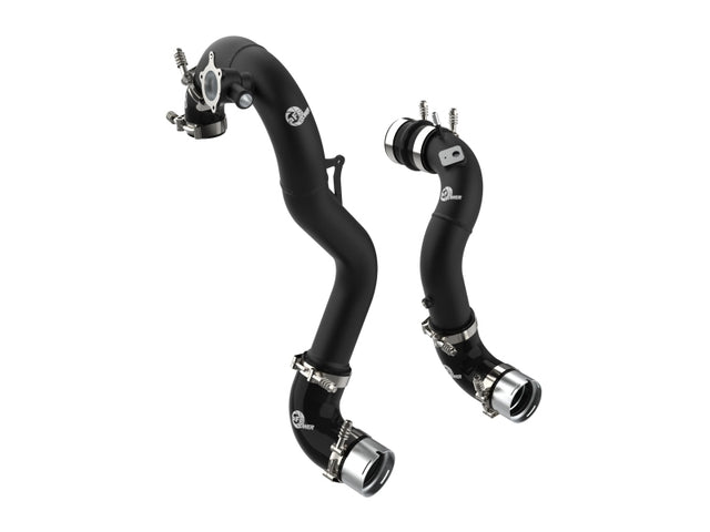 Smooth transitions in the mandrel-bent aluminum pipes decrease turbulence and minimize pressure loss, increasing horsepower and torque. This charge pipe kit provides a smooth transition between the turbo and the engine for lower operating temperatures and increased power. This kit includes high-quality, stainless-steel, spring-loaded T-bolt clamps and heavy-duty, 5-ply, polyester reinforced silicone couplings. This charge pipe kit also features factory style billet aluminum quick-connect adapters with O-rings to ensure a leak-free fit while maintaining superior strength and durability. Finished in wrinkle black powder coating with a unique laser-etched aFe power logo for a custom look.