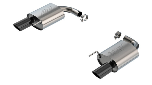 This 2.5" diameter Borla(r) Axle-Back exhaust system is designed to fit the 5.0L Mustang GT that is NOT equipped with Active Exhaust. It features 4" black chrome on T-304 stainless steel tips and the classic S-Type sound level with no drone inside the vehicle. Using Borla(r) Stainless Steel Polish p# 21461 is NOT recommended with these black chrome tips. We suggest cleaning the tips with hot water and a microfiber cloth. Systems with bright chrome on T-304 stainless steel tips, and carbon fiber tips are also available. It fits both the coupe and convertible models. The straight-through and patented multi-core technology is designed to unleash hidden horsepower. Increased exhaust velocity adds power, driving excitement, fuel economy, and the distinctive Borla(r) Sound of Power respected by motoring enthusiasts everywhere. Each system is built from premium T-304 stainless steel, superior to T-400 series knockoffs (such as 409), to give you the absolute best in performance and durability. Ultra-smooth mandrel bends ensure maximum flow & power, and precision computer numerical control (CNC) manufacturing ensures an accurate fit. Best of all, Borla(r) stands behind every system with a Million-Mile Warranty. Just what you'd expect from the world's most experienced (and most winning) exhaust brand.