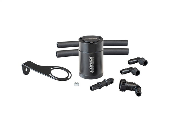 CORSA Performance's oil catch cans are the latest in a line of performance parts designed to maximize vehicle performance and longevity. Made from 6061 aluminum and featuring a multi-stage oil separation system, CORSA Performance oil catch cans work to eliminate blow-by of gas, water, oil vapors and particulates from the airpath. By reducing the impacts of blow-by, oil catch cans prevent damage to sensitive intake components and helps reduce carbon build-up on valves that over time reduce engine performance. Each vehicle specific oil catch can has been designed with OEM style quick disconnect fittings, premium automotive-grade hoses and upgraded components to ensure your vehicle runs at peak performance. Through careful design CORSA engineers have mounted each oil catch can in an easily accessible yet safe location allowing for ease of serviceability.