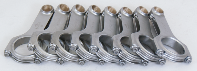 Forged 4340 steel H-Beam connecting rods are forged from a two-piece forging and feature a fully machined and shot-peened surface. Sizing is held to exact tolerances. Sold as a weight-matched set. Recommended for competition use.