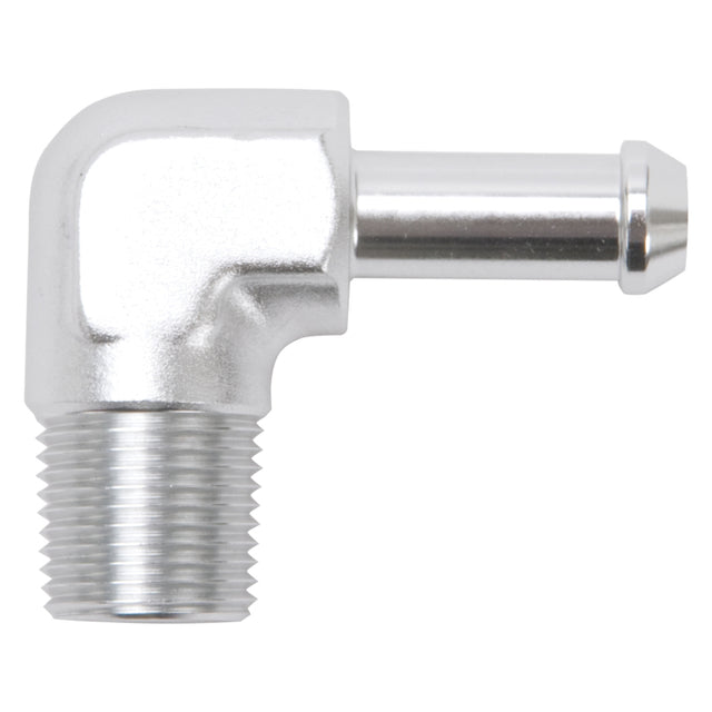 Edelbrock Hose End 90-Deg 3/8In NPT to 3/8In Barb Clear Anodize