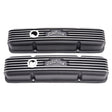 Edelbrock part #41433 Classic Series Valve Covers are designed for Chevy 262-400 V8 1959-86 (with breather holes) applications and have a Black powder coat finish. Edelbrock first made these aluminum valve covers in the late '50s and they're still a classic. Made of heavy-gauge sand-cast aluminum, Overall height is measured from base to top at the highest point. Edelbrock classic valve covers can be machined to accept breathers if desired.