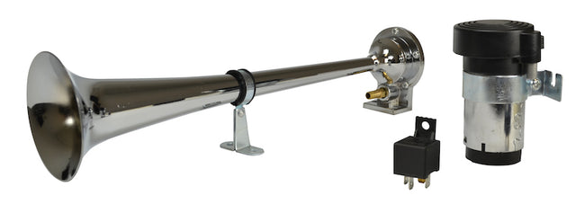 The HELLA CA30 Series Chrome Tone Air Horn is designed to deliver unmatched sound intensity and clarity. This horn features super loud and high-penetrating power tones, ideal for drivers who must assert their presence on the road. It operates pneumatically; it's specifically tailored for vehicles equipped with a compressed air brake system, ensuring seamless integration and functionality. The sleek chrome finish of the horn adds a touch of sophistication and durability, making it a visually appealing addition to any vehicle. Perfect for both professional and personal use, the CA30 Series horn is the go-to choice for superior sound performance and reliability.