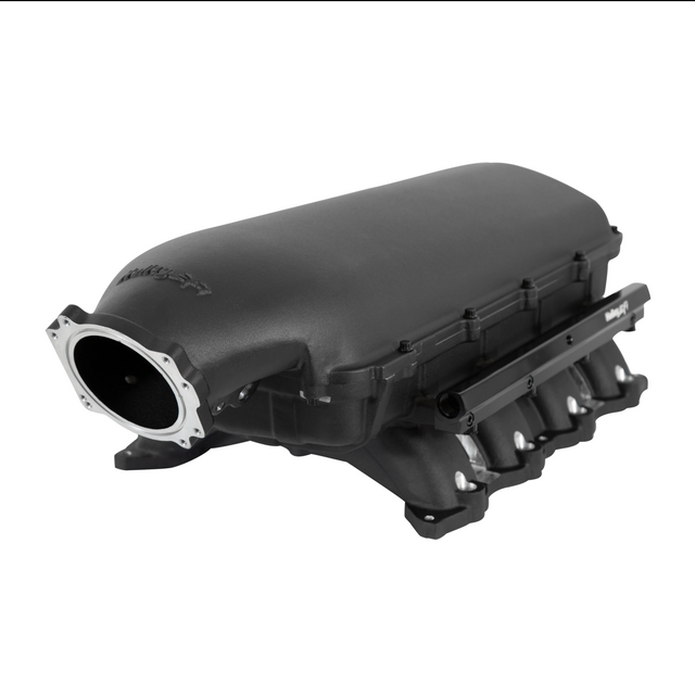 Another new Ford Coyote Hi-Ram version is ready for release. 300-915, natural finish, and 300-915BK, black finish, are top-feed plenum Coyote Hi-Ram intake manifold kits with a new plenum top that provides mounting for round throttle bodies. Standard mounting patterns on the throttle body flange with a 93mm flange opening include GT350, GT500, and LS 4-bolt throttle bodies. 2011-2013 GT throttle bodies may be used with the optional 717-18 adaptor. The 300-915/BK simplifies the fabrication of inlet piping which is more simply mated to a round throttle body. In combination with the Hi-Ram top-feed plenum flange which accepts plenum mounted intercoolers, 300-915/BK may become the favored Coyote Hi-Ram for forced induction engine builds. Like the other Coyote Hi-Ram manifold kits, included are fuel rails for use with OEM type fuel injectors and clips, mounting hardware, and O-ring gaskets. Offered in black and natural as-cast finish, both manifolds have a 9.20-inch runner length, ample plenum volume, and are designed to improve the mid to high RPM powerband.