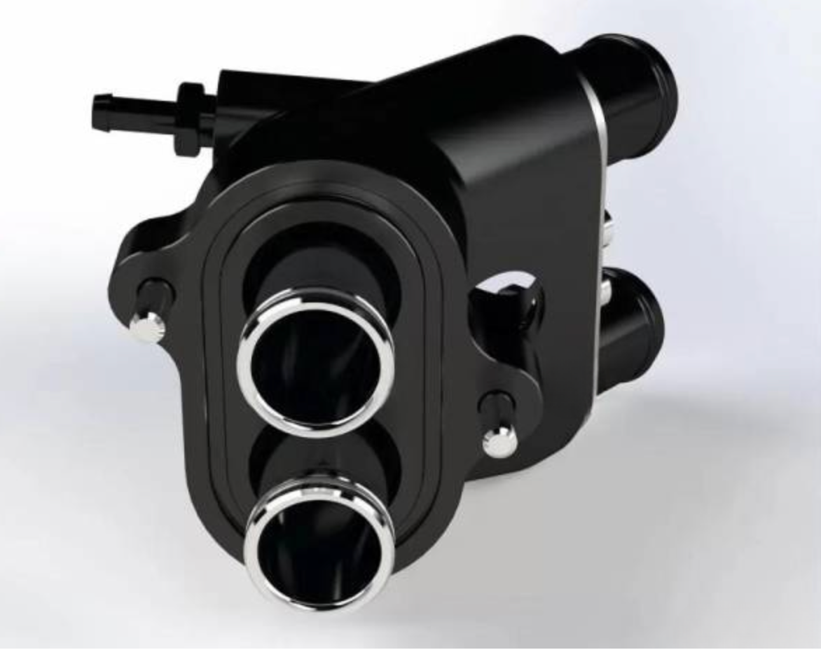 Whipple's all new, 6061-T6 billet intercooler manifold not only looks incredible, it flows more fluid than the stock cast design. With a full modular design, you can simply install in a stock system, with stock lines and stock intercooler core, or you can couple with the Whipple Billet Super High Density upgraded intercooler core. The billet manifold, which is Type 2 black anodized fits directly in the stock location with no modifications required.
