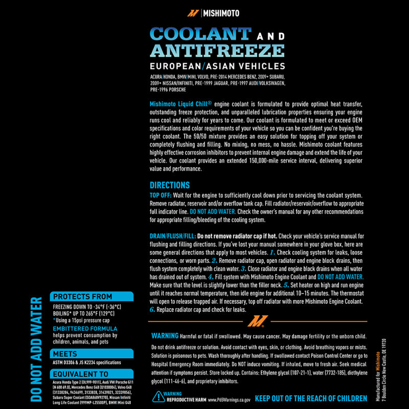 Mishimoto's Liquid Chill Original Equipment engine coolant is formulated with an ethylene glycol base to provide optimalheat transfer, boiling protection up to 265F, freeze protection down to -34F, unparalleled anti-corrosion, and superiorlubrication, ensuring your engine runs cool and reliably for years to come. The pre-diluted 50/50 mixture provides an easysolution for topping off your system or complete flushing and filling. No mixing, no mess, no hassle.----We offer bothuniversal and color-coded formulas that match your vehicle manufacturer' s specifications to make selecting the rightcoolant easy. Our coolant provides an extended 5 year/150,000-mile service interval, delivering superior value andperformance. This one-gallon bottle of blue coolant is specially formulated to be equivalent to Acura/Honda Type 2,Porsche G11, Mercedes Benz/Volvo/BMW/Mini G48, Subaru Super Coolant, and Nissan/Infiniti Long Life Coolant. It meetsASTM D3306 and JS K2234 specifications for your Acura, Honda, BMW, MINI, Mercedes Benz, Subaru, Nissan, Infiniti,Jaguar, VW, Audi, or Porsche vehicle.