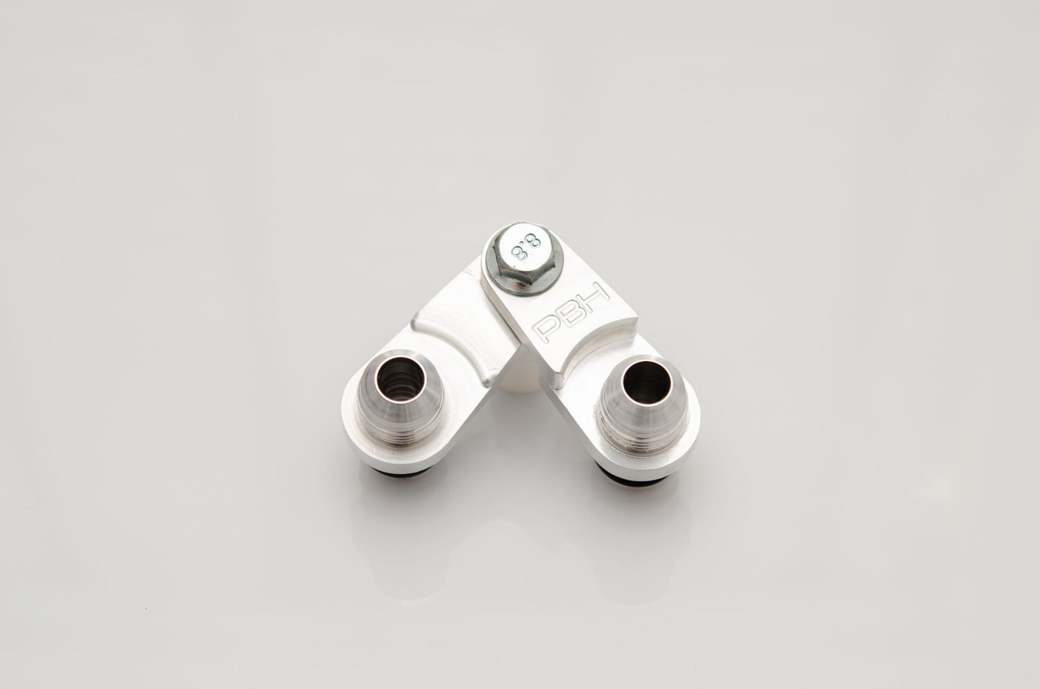 We have released our 6R80 and 10R80 cooler fittings. These fittings are designed to allow replacement of the factory cooler lines for upgraded coolers or in the case of doing a Coyote powertrain swap where a factory cooler can not be used. Our fittings will go in the factory ports on the side of the trans and supply a -8an fitting that can be rotated 360 degrees with out colliding with one another. The bracket supplied can be installed once the fittings are in place and are held down with supplied hardware. They are made here in the USA and anodized black with PBHPERFORMANCE.COM script.