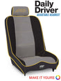 While having a lot of containment in off-road racing seats is nice when you’re actually off-road, it really gets old if you take your rig to work everyday or just drive it a few times a week. The Daily Driver Suspension Seat has 5” of containment which will hold you in on the trail but still make it easy to climb in and out of your Jeep or truck. The vinyl-coated nylon suspension liner and dual-density foam decrease the impact on the body, reducing the fatigue you feel after a long day in the dirt or dunes. Customize your seat with over 60 fabric and color options as well as features like heaters, lumbar support, and storage pockets. The bottom tabs easily bolt to PRP’s series of mounts built for Jeep, Broncos, Toyota Tacomas, Ford Rangers, and more. Like all of PRP’s Classic Series seats, the Daily Driver can be built up to 4” taller and 2” wider (Be sure to measure your vehicle to see if you have enough room). As an alternative to the height options, you can change the classic hoop to an adjustable headrest or eliminate the headrest altogether for that vintage low back look. NOTE: Extra wide seats will not fit in Jeep models unless you have made significant changes to the interior. Please review your measurements closely.