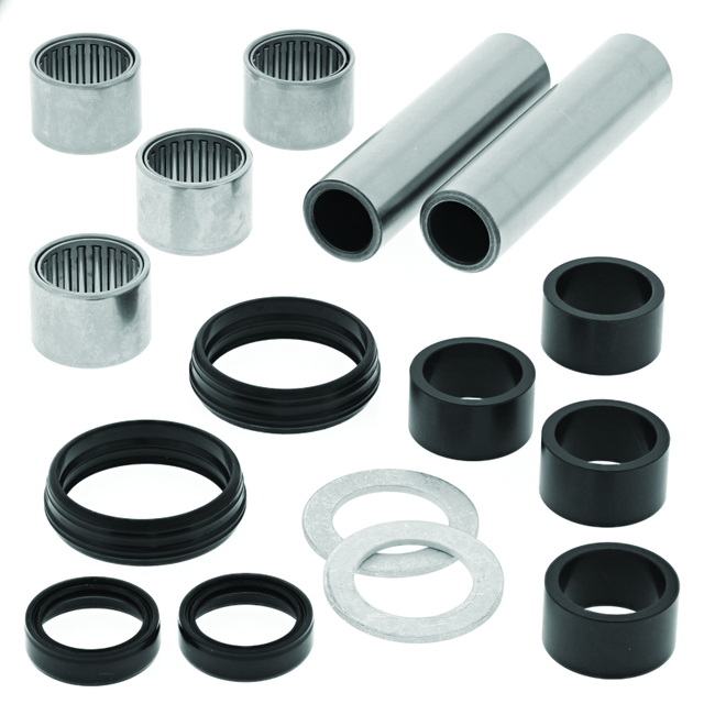 Ensure your swingarm bearing assembly is properly rebuilt with this repair kit. Needle bearing shafts are made with 52100 bearing steel that has been hardened and precision ground. All metal bushings are case-hardened and plated to prevent wear and corrosion. POM composite washer bearings replace thrust needle washers for increased service life and superior resistance to water and dirt.