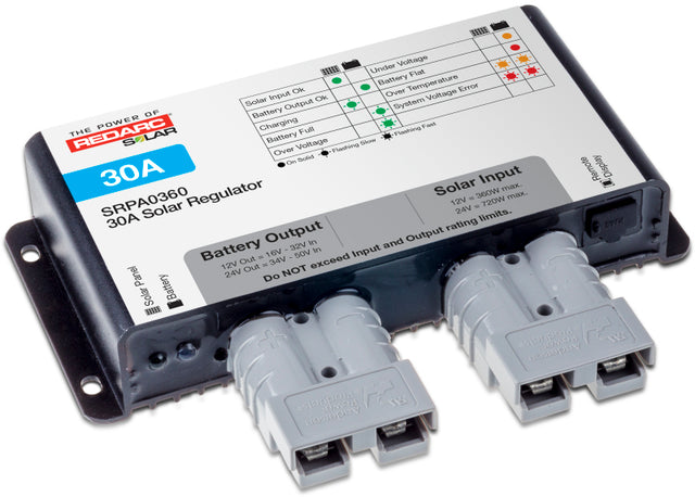 The REDARC 30A Solar Regulator ensures the correct charge is supplied safely and efficiently to charge an auxiliary battery and is ideal when multiple REDARC solar blankets are used simultaneously. Available with Anderson? SB?50 connectors. REDARC?S newly designed 30 Amp Solar Regulator comes with the Anderson? SB?50 connectors and is ideal for use when multiple REDARC solar blankets are used simultaneously. REDARC?s 30 Amp Solar Regulator acts as the go between to transfer power generated from the panels to the battery. Featuring multistage charging; boost, absorption and float, REDARC?s 30 Amp Solar Regulator ensures that the correct charge is supplied safely and efficiently to the battery and will protect it from over charging. It will work with multiple chemistry batteries including AGM, Standard and Calcium*, is?ideal for permanent installation or portable systems, and has multiple levels of protection including over temperature, over charge and reverse polarity.