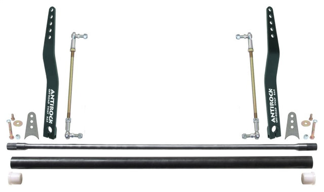 RockJocks Antirock sway bar kits are available in a universal fit configuration for those building their own custom rigs and rock buggies. This universal kit features a 32 in. torsion bar length and bent 20 in. long fabricated steel arms. Vertical links use a 14 in. long 1/2 in. x .20 RH/LH threaded rod that can be cut down to your desired length, and the necessary 1/2 in. x 20 thread heim joint rod ends, jam nuts, and tabs to weld to your axle tube are supplied. Also supplied is the universal weld-in 1.75 in. x .095 wall DOM tube that is cut to the proper length to work with the torsion bar length, and the delrin bushings to support the bar in the tube. The 32 in. bar is a .700 in. diameter. These kits require fabricating for installation -- these are NOT bolt-on kits.
