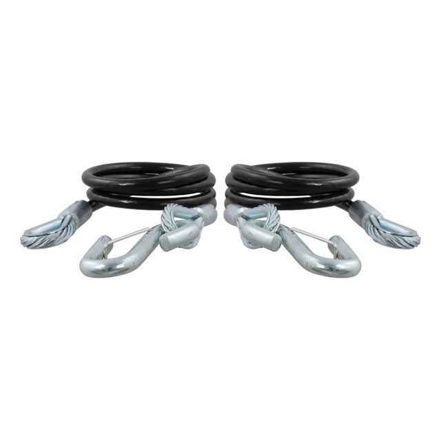 Curt's 44 1/2 in. Tow Bar Safety Cable Kit is the smart, safe and in most cases - required by law, way to tow. No matter how far you are planning to drive - down the street or across the state - without safety chains attached, there is a serious risk of danger if your trailer or towed vehicle becomes uncoupled from your trailer hitch. An alternative to traditional safety chains is Curt safety cables. Safety cables are a medium-duty safety option and are very effective for most standard trailers or towed vehicles. Curt safety cables are coiled so they do not drag on the ground, and they are fitted with safety latches, instead of S-hooks, to prevent them from becoming unhooked even over bumps and rough roads. One unique feature of Curt safety cables is their vinyl coating. Being coated in a vinyl skin keeps these cables well protected from rust, reduces the amount of noise they make and makes them easier to handle. These particular safety cables offer a minimum break force of 5,000 lbs. and measure a total length of 42 in..