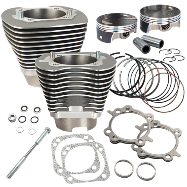 This big bore cylinder and piston kit can be used as replacement for the cylinders and pistons for an S&S 124" Hot Set Up Kit, a T124 T2 engine or as the basis for a new engine build. Kit contains S&S 4-1/8" bore cylinders and forged flat dome pistons, rings, wrist pins, head and base gaskets. The cylinders are machined with the stock bolt pattern and are intended for use in stock crankcases of 2007-'16 big twin engines. This kit must be used with 4-5/8" flywheels resulting in 124' displacement. Cylinder finish is a durable Stone Gray powder coat that matches stock CVO engine finsh. This cylinder kit may be used with stock or S&S cylinder heads with stock bolt pattern. For best performance, appropriate camshafts, performance air cleaner, performance exhaust and fuel system tuning are required.
