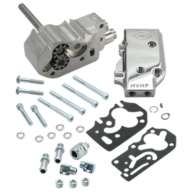 S&S polished billet oil pump kit with universal cover fits 1984-1991 HD® Big Twins. This high volume, high pressure pump only kit includes supply gears, return gears, drive shaft, drive shaft keys, drive shaft snap rings, check ball, check ball spring, pressure valve, pressure valve spring, cover screws with o-rings, miscellaneous hose fittings, plugs, screws, paper gaskets, and mounting hardware.