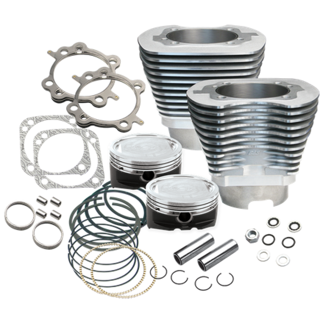This big bore cylinder and piston kit contains S&S 4-1/8" bore cylinders and forged pistons, rings, wrist pins, head and base gaskets. Pistons are machined with a 10.9cc dish and ar intended for use with stock cylinder heads. The cylinders are machined with the stock bolt pattern and are intended for use in stock crankcases of 1999-'06 big twin engines. Designed for 4-5/8" stroke flywheels, resulting in 124" displacement. Cylinder finish is a durable silver powder coat. For best performance, appropriate camshafts, performance air cleaner, performance exhaust and fuel system tuning are required.