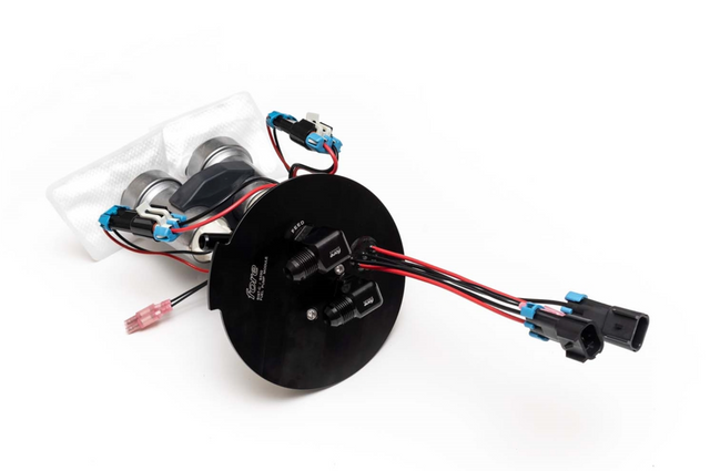 This is part of a stand alone fuel system. Professional installation and a custom tune is required. Qualified installers and tuners must be able to interface to the OE harness and FPDM, understand proper component placement, hose routing, and deliver the vehicle with factory-like pump prime/on/off logic with no error codes. Fore Innovations will supply basic system schematics and detailed component level instructions, and can provide troubleshooting of the performance and function of our system and components. Fore Innovations will not provide assistance with ECU integration/tuning or elimination of alarm codes or the CEL.This fuel pump generates substantially more heat and capacity than the original fuel system. The high powered fuel pumps make much more heat than the factory pump and the composite fuel tank construction acts as an insulator and stores heat. Additionally, the shape of the factory fuel tank limits the pickup capacity of this fuel system. The user (driver) must keep more fuel (than normal) in the tank at all times to minimize heat damage and ensure adequate fuel pickup.