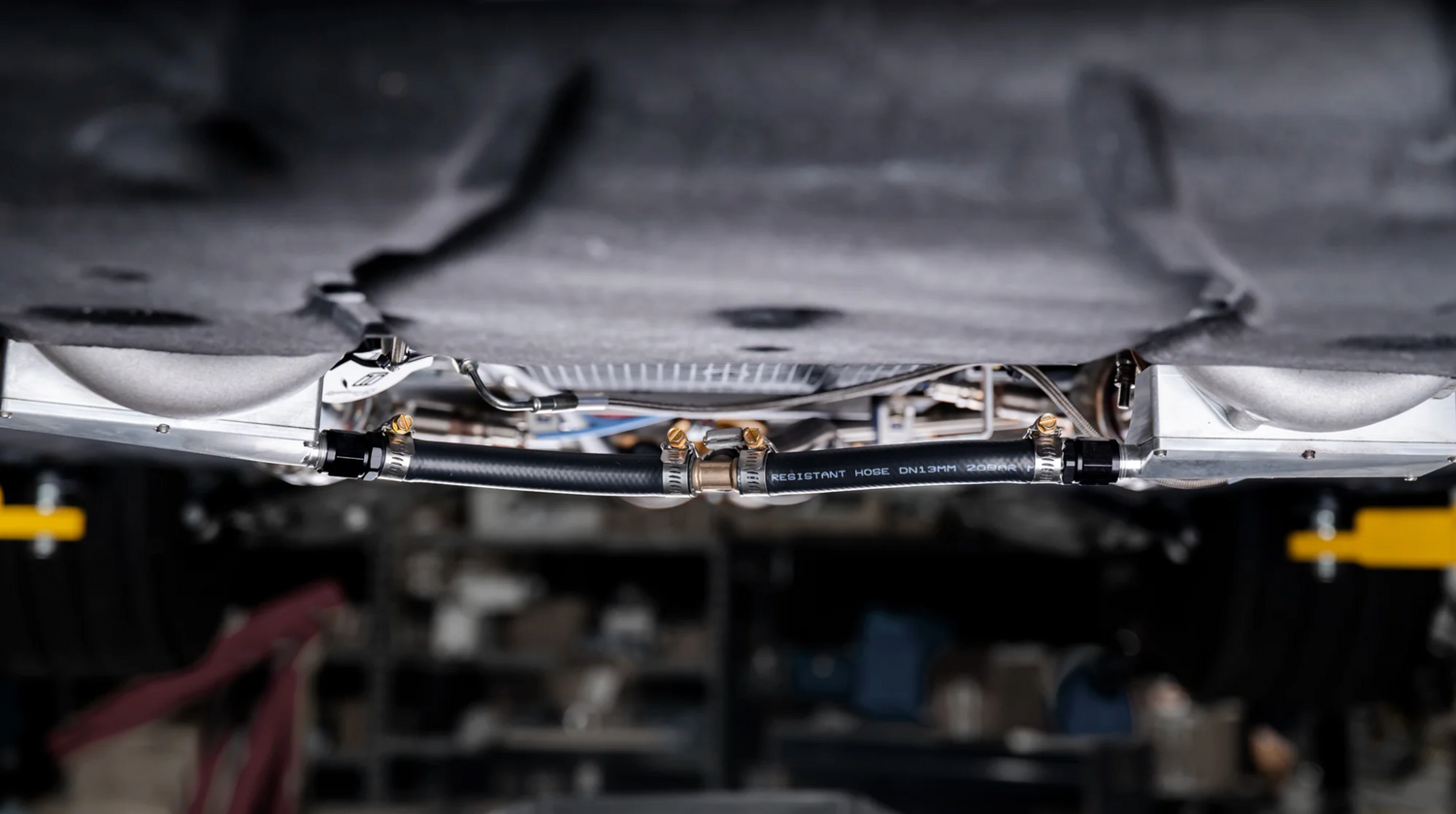 SPE designed filters that tuck up and away from debris and weather while maintaining the surface area needed for high horsepower. The intercooler is the largest bolt-on unit that fits without modifying the car. It’s built around a vertical 6” core with 3/16” TIG-welded sheet metal end tanks and billet hose ends.