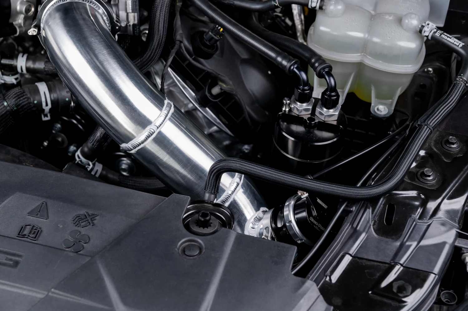 Charge piping connects at the throttle body with our HD clamp adapter. No visible silicone couplers under the hood.