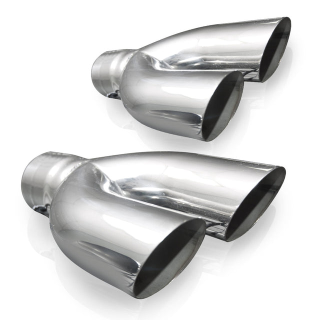 Pair of Y-style tips, with 2" ID inlet, 2" OD outlets with an overall length of 9" Slash cut. Can be clamped or welded in place. Made from 304 stainless steel for maximum corrosion resistance. Hand mirror polished finish. The quality of our tips is far superior to the less expensive tips on the market. These are TIG welded for strength and durability. These kits come with a lifetime warranty and proudly made in the USA.
