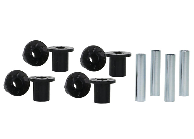 All in one leaf spring bushing service kit covering front and rear eyes of the leaf plus shackle bushings. High kilometres and heavy load carrying causes excessive wear on rubber bushings. Whiteline's signature black bushings are made tough and offer outstanding abrasion resistance, high load bearing capability (4WD's, utes and towing), flexibility, increased tensile strength and chemical resistance to oil, grease, ozone and weathering.