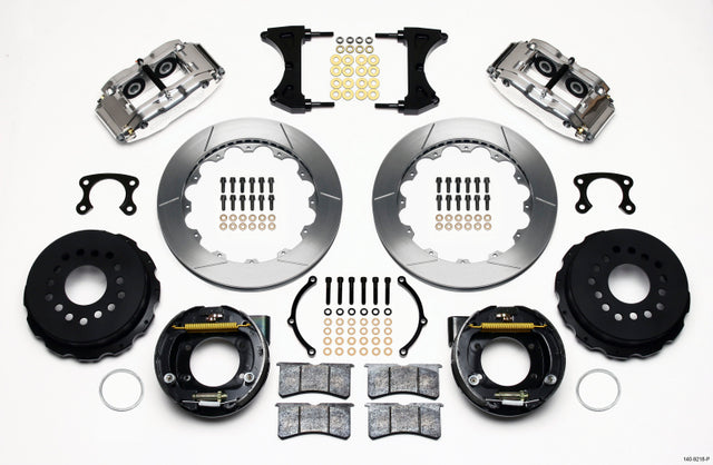 Forged Narrow Superlite 4R rear disc kits provide the ultimate Big Brake solution for popular muscle car rear axles that require a parking brake. FNSL4R four piston calipers, 13” or 14” two-piece rotors, and high performance BP-10 compound pads provide optimized and balanced braking to compliment front big brake upgrades on all types of custom, show and high performance street machines. The neatly hidden internal shoe system provides a clean installation with superior static holding power for parking. Optional caliper finishes and rotor designs allow builders to personalize the style and performance for every application.